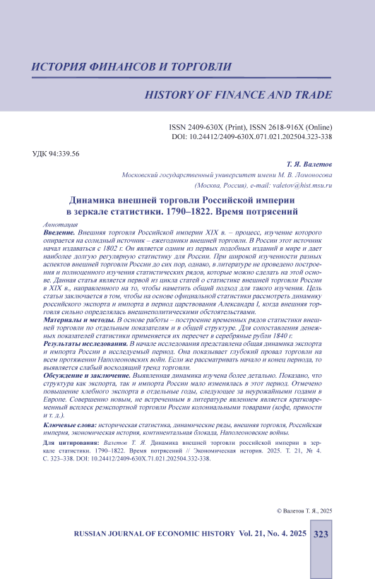 Введение. Внешняя торговля Российской империи XIX в. – процесс, изучение которого опирается на солидный источник – ежегодники внешней торговли. В России этот источник начал издаваться с 1802 г. Он является одним из первых подобных изданий в мире и дает наиболее долгую регулярную статистику для России. При широкой изученности разных аспектов внешней торговли России до сих пор, однако, в литературе не проведено построения и полноценного изучения статистических рядов, которые можно сделать на этой основе. Данная статья является первой из цикла статей о статистике внешней торговли России в XIX в., направленного на то, чтобы наметить общий подход для такого изучения. Цель статьи заключается в том, чтобы на основе официальной статистики рассмотреть динамику российского экспорта и импорта в период царствования Александра I, когда внешняя торговля сильно определялась внешнеполитическими обстоятельствами. Материалы и методы. В основе работы – построение временных рядов статистики внешней торговли по отдельным показателям и в общей структуре. Для сопоставления денежных показателей статистики применяется их пересчет в серебряные рубли 1840 г. Результаты исследования. В начале исследования представлена общая динамика экспорта и импорта России в исследуемый период. Она показывает глубокий провал торговли на всем протяжении Наполеоновских войн. Если же рассматривать начало и конец периода, то выявляется слабый восходящий тренд торговли. Обсуждение и заключение. Выявленная динамика изучена более детально. Показано, что структура как экспорта, так и импорта России мало изменялась в этот период. Отмечено повышение хлебного экспорта в отдельные годы, следующее за неурожайными годами в Европе. Совершенно новым, не встреченным в литературе явлением является кратковременный всплеск реэкспортной торговли России колониальными товарами (кофе, пряности и т. д.).