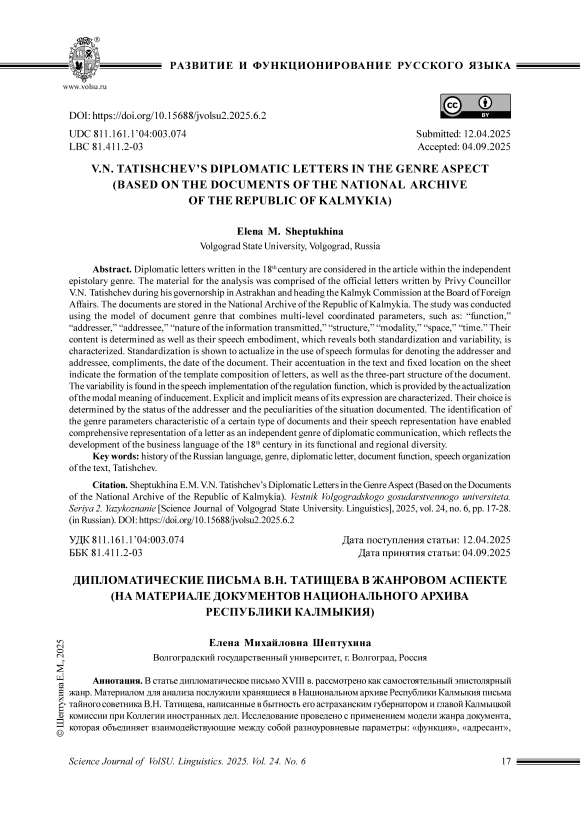 В статье дипломатическое письмо XVIII в. рассмотрено как самостоятельный эпистолярный жанр. Материалом для анализа послужили хранящиеся в Национальном архиве Республики Калмыкия письма тайного советника В.Н. Татищева, написанные в бытность его астраханским губернатором и главой Калмыцкой комиссии при Коллегии иностранных дел. Исследование проведено с применением модели жанра документа, которая объединяет взаимодействующие между собой разноуровневые параметры: «функция», «адресант», «адресат», «характер передаваемой информации (информация)», «структура», «модальность», «пространство», «время». Определено их содержательное наполнение и речевое воплощение, которое обнаруживает как стандартизованность, так и вариативность. Показано, что стандартизованность обеспечивается трехчастной структурой документа и речевыми формулами для выражения адресанта и адресата, комплимента, даты составления документа, их выделением из текста и фиксированным расположением на листе, что свидетельствует о формировании реквизитного состава писем. Вариативность обнаруживается в речевой реализации функции регулирования, которая обеспечивается актуализацией модального значения побуждения. Описаны эксплицитные и имплицитные средства его выражения, выбор которых обусловлен статусом адресанта и спецификой документируемой ситуации. Выявление жанровых параметров письма и их речевой репрезентации позволило комплексно представить его как самостоятельный жанр дипломатического общения, отражающий развитие делового языка XVIII в. в его функциональном и региональном разнообразии.