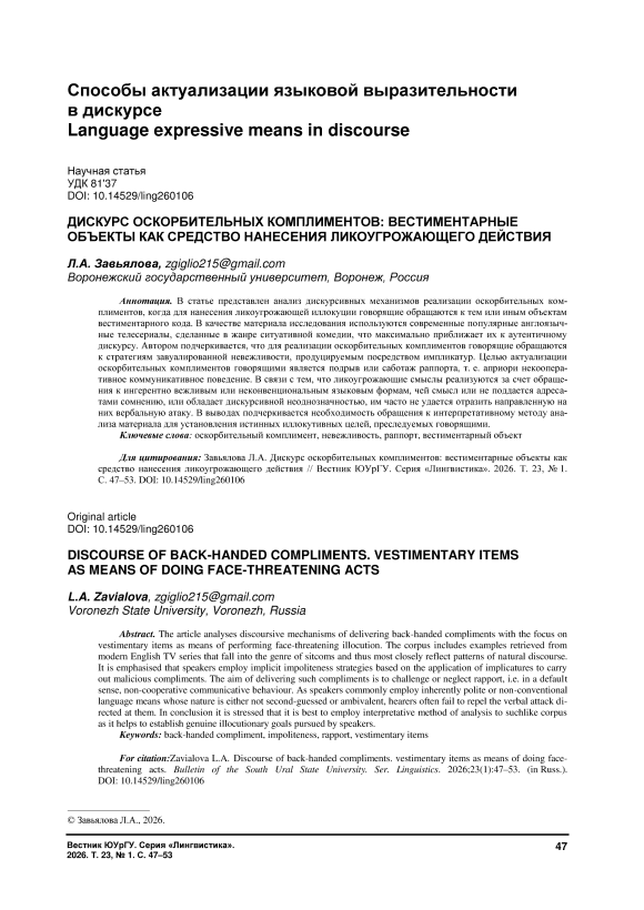 В статье представлен анализ дискурсивных механизмов реализации оскорбительных комплиментов, когда для нанесения ликоугрожающей иллокуции говорящие обращаются к тем или иным объектам вестиментарного кода. В качестве материала исследования используются современные популярные англоязычные телесериалы, сделанные в жанре ситуативной комедии, что максимально приближает их к аутентичному дискурсу. Автором подчеркивается, что для реализации оскорбительных комплиментов говорящие обращаются к стратегиям завуалированной невежливости, продуцируемым посредством импликатур. Целью актуализации оскорбительных комплиментов говорящими является подрыв или саботаж раппорта, т. е. априори некооперативное коммуникативное поведение. В связи с тем, что ликоугрожающие смыслы реализуются за счет обращения к ингерентно вежливым или неконвенциональным языковым формам, чей смысл или не поддается адресатами сомнению, или обладает дискурсивной неоднозначностью, им часто не удается отразить направленную на них вербальную атаку. В выводах подчеркивается необходимость обращения к интерпретативному методу анализа материала для установления истинных иллокутивных целей, преследуемых говорящими.