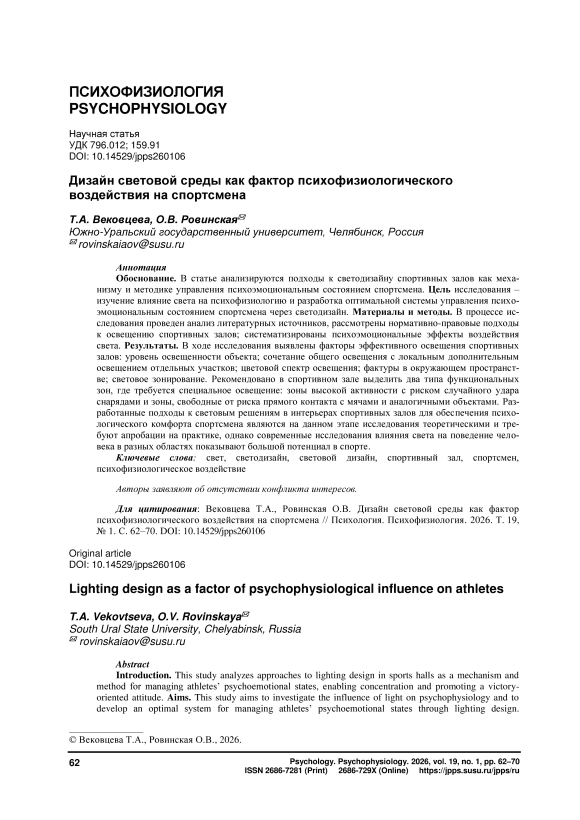 Проведен анализ литературных источников, рассмотрены нормативно-правовые подходы к освещению спортивных залов; систематизированы психофизиологические и психоэмоциональные эффекты воздействия света.