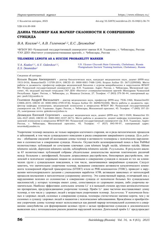 Укорочение теломер оказалось не только маркером клеточного старения, но и ряда патологических процессов и заболеваний, в том числе суицидального поведения и риска совершения завершённого суицида. Цель работы ‒ обобщение сведений об ассоциации длины теломер и активности теломеразы с психическим нарушениями и склонностью к совершению суицида. Методы. Осуществлён целенаправленный поиск в базе PubMed полнотекстовых публикаций по сочетанию ключевых слов telomere length sucide, telomeres suicide, lithium telomeres suicide, depression telomeres suicide, schizophrenia telomeres suicide. Результаты. В результате анализа 65 полнотекстовых публикаций собраны убедительные доказательства наличия генетических различий между больными с шизофренией, большим депрессивным расстройством, биполярным расстройством, эпилепсией и психически здоровыми лицами не склонными к совершению суицидов и людьми из тех же клинических групп с суицидальным поведением, в том числе, закончившимся завершённым суицидом. Следует заметить, что значительное укорочение теломер, вызванное снижением активности каталитического компонента теломеразной обратной транскриптазы (hTERT) и/или ее РНК-компонентом (TERC), приводит к нарушению митохондриального дыхания с уменьшением наработки АТФ, активации зависимых от митохондрий процессов воспаления и патологически ускоренному апоптозу. Это единственный маркер, отличающий лиц с нарушениями психики со склонностью к совершению суицида от психически больных без суицидальных наклонностей, у которых теломеры имеют длину, сопоставимую со здоровыми лицами, либо укорочены незначительно. Наиболее эффективно длительное лечение Li+ и в меньшей степени другими антипсихотическими препаратами, предупреждающими укорочение теломер. Приём Li+ даже частично восстанавливает длину теломер, в том числе у здоровых людей с возрастным укорочением теломер. Заключение. У психически больных и здоровых людей, склонных к совершению суицида, теломеры статистически значимо короче, чем у не склонных к суициду здоровых людей и пациентов с психическими заболеваниями. Врождённое и приобретённое укорочение длины теломер может использоваться как ранний маркер потенциальной склонности к совершению самоубийства для формирования целевых групп с целью профилактики суицидов и доклинического выявления лиц с потенциальным риском развития нарушений психики. Длительный приём Li+ предупреждает укорочение теломер и уменьшает риск совершения суицида, восстанавливая сниженную теломеразную активность до значений, близких к физиологическим.
