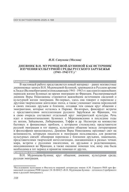 В настоящей работе представляется новый материал – ранее неизвестные дневниковые записи В.Н. Муромцевой-Буниной, хранящиеся в Русском архиве в Лидсе (Великобритания) и описывающие 1941–1943 гг. как один из важнейших периодов жизни Буниных во время эмиграции во Франции. Рассматриваемый дневник Веры Николаевны становится важнейшим источником сведений о культурной жизни эмиграции. Во-первых, здесь она говорит о переписке с другими творческими деятелями эпохи, а также упоминает имена персоналий в своих письмах друзьям и близким, создавая тем самым круг общения с эмигрантами, которые остались в Париже. Во-вторых, фиксирует встречи с представителями интеллигенции русского Зарубежья во Франции, что в свою очередь составляет отдельный круг эмигрантской культуры. Речь идет о взаимоотношениях Буниных с Мережковскими в последние годы их жизни, Зайцевыми, Либерманами, Тэффи и др. Несмотря на множество бытовых и финансовых проблем, с которыми столкнулись представители русской эмиграции в тот период, культурное общение между литераторами и философами продолжалось. Дневник Веры Николаевны проливает свет на возможности, которыми писатели в эмиграции пользовались для развития культурных связей: обширная переписка с близкими друзьями, знакомыми, представителями творческой интеллигенции, оказавшимися в разных точках мира, встречи с русскими писателями, их друзьями и родственниками, находившимися во Франции, а также оказание помощи тем, кому она была необходима в тот период и принятие помощи от других.