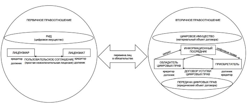 Так как в классическом договоре используется категория «вещь» в материальном понимании, то цессия выступает в качестве дополнительной надстройки для некоторых правоотношений. В нашем случае уступка цифровых прав будет универсальным инструментом для любых видов договорных обязательств в силу отсутствия цифрового имущества в материальном мире, а значит, невозможности отчуждения без передачи цифровых прав на него. Во вторичном правоотношении обладатель цифровых прав (например, продавец цифрового имущества) обязуется передать цифровой объект посредством уступки цифровых прав, а приобретатель выплачивает стоимость такого объекта. После того как стороны выполнили свои обязанности по договору, происходит перемена лиц в обязательстве. Обладатель направляет информационному посреднику запрос о передаче цифровых прав на конкретный цифровой объект, а посредник обеспечивает сделку. После цессии приобретатель цифровых прав имеет право требования цифрового имущества у правообладателя посредством реализации технических мер (ввода идентификационных данных, ключа доступа и т. д.).