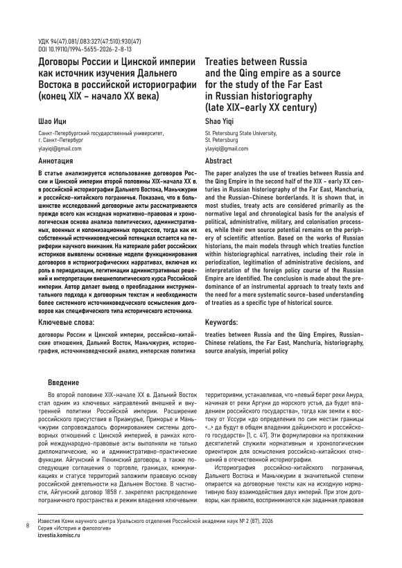 The paper analyzes the use of treaties between Russia and the Qing Empire in the second half of the XIX – early XX centuries in Russian historiography of the Far East, Manchuria, and the Russian–Chinese borderlands. It is shown that, in most studies, treaty acts are considered primarily as the normative legal and chronological basis for the analysis of political, administrative, military, and colonisation processes, while their own source potential remains on the periphery of scientific attention. Based on the works of Russian historians, the main models through which treaties function within historiographical narratives, including their role in periodization, legitimation of administrative decisions, and interpretation of the foreign policy course of the Russian Empire are identified. The conclusion is made about the predominance of an instrumental approach to treaty texts and the need for a more systematic source–based understanding of treaties as a specific type of historical source.
