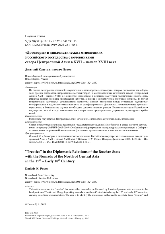 На основе делопроизводственной документации анализируются «договоры», которые заключали или обсуждали русские дипломаты, направленные в ставки тюрко- и монголоязычных кочевников севера Центральной Азии в XVII – начале XVIII в. Предметом «договоров» в основном выступали политические (шерть, ясак, аманаты; возврат пленных; прекращение набегов), а иногда и экономические (торговля) вопросы. В случае конфронтации «договоры» устанавливали параметры мирных отношений между сторонами. «Договоры» не оформлялись в виде самостоятельного акта, не ратифицировались. Дипломаты, уполномоченные проводить переговоры, в большинстве случаев не обладали дипломатическим рангом. Политические цели Российского государства, низкий статус кочевников как контрагентов предопределили упрощение процедурных требований.