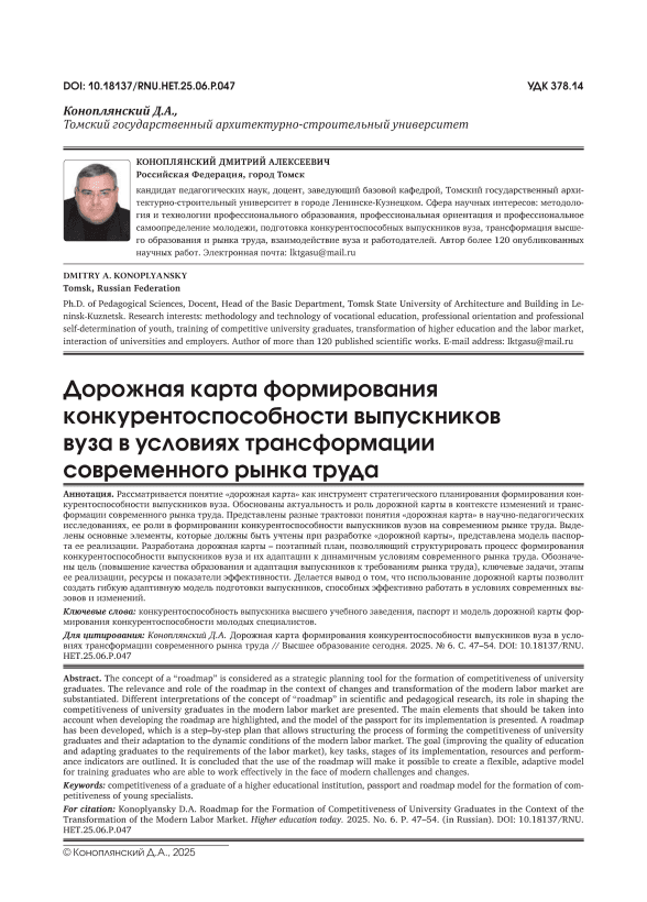 Рассматривается понятие «дорожная карта» как инструмент стратегического планирования формирования конкурентоспособности выпускников вуза. Обоснованы актуальность и роль дорожной карты в контексте изменений и трансформации современного рынка труда. Представлены разные трактовки понятия «дорожная карта» в научно-педагогических исследованиях, ее роли в формировании конкурентоспособности выпускников вузов на современном рынке труда. Выделены основные элементы, которые должны быть учтены при разработке «дорожной карты», представлена модель паспорта ее реализации. Разработана дорожная карты – поэтапный план, позволяющий структурировать процесс формирования конкурентоспособности выпускников вуза и их адаптации к динамичным условиям современного рынка труда. Обозначены цель (повышение качества образования и адаптация выпускников к требованиям рынка труда), ключевые задачи, этапы ее реализации, ресурсы и показатели эффективности. Делается вывод о том, что использование дорожной карты позволит создать гибкую адаптивную модель подготовки выпускников, способных эффективно работать в условиях современных вызовов и изменений.
