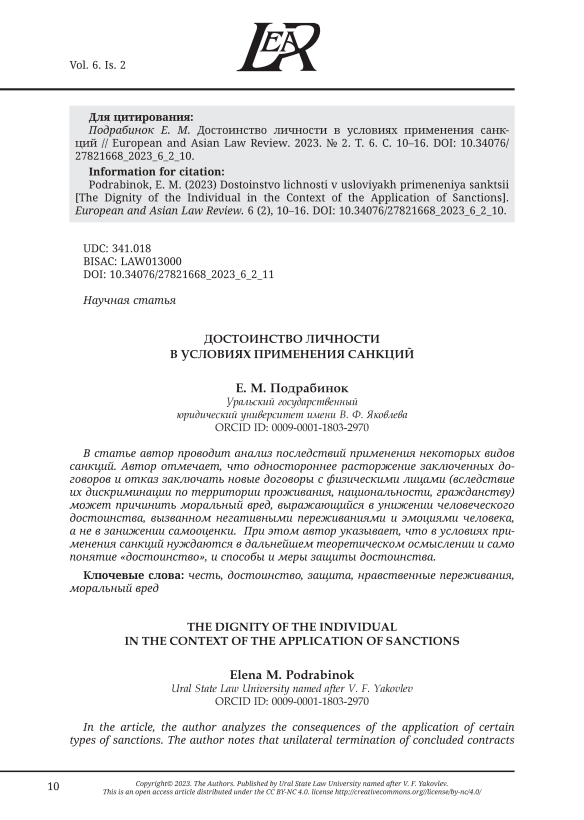 Текст статьи ДОСТОИНСТВО ЛИЧНОСТИ В УСЛОВИЯХ ПРИМЕНЕНИЯ САНКЦИЙ