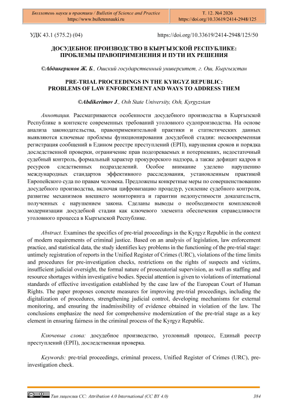 Examines the specifics of pre-trial proceedings in the Kyrgyz Republic in the context of modern requirements of criminal justice. Based on an analysis of legislation, law enforcement practice, and statistical data, the study identifies key problems in the functioning of the pre-trial stage: untimely registration of reports in the Unified Register of Crimes (URC), violations of the time limits and procedures for pre-investigation checks, restrictions on the rights of suspects and victims, insufficient judicial oversight, the formal nature of prosecutorial supervision, as well as staffing and resource shortages within investigative bodies. Special attention is given to violations of international standards of effective investigation established by the case law of the European Court of Human Rights. The paper proposes concrete measures for improving pre-trial proceedings, including the digitalization of procedures, strengthening judicial control, developing mechanisms for external monitoring, and ensuring the inadmissibility of evidence obtained in violation of the law. The conclusions emphasize the need for comprehensive modernization of the pre-trial stage as a key element in ensuring fairness in the criminal process of the Kyrgyz Republic.