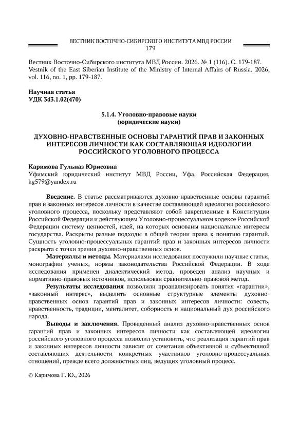 The article examines the spiritual and moral foundations of guarantees of the rights and legitimate interests of the individual as a component of the ideology of the Russian criminal process, since they represent a system of values and ideas enshrined in the Constitution of the Russian Federation and the current Code of Criminal Procedure of the Russian Federation, on which the national interests of the state are based. Different approaches in the general theory of law to the concept of guarantees are revealed. The essence of criminal procedural guarantees of the rights and legitimate interests of the individual is revealed from the point of view of spiritual and moral foundations. Materials and methods. The research materials were scientific articles, monographs of scientists, norms of the legislation of the Russian Federation. In the course of the research, the dialectical method was applied, the analysis of scientific and regulatory sources was carried out, and the comparative legal method was used. The research results made it possible to analyze the concepts of "guarantees" and "legitimate interest", to identify the main structural elements of the spiritual and moral foundations of guarantees of individual rights and legitimate interests: conscience, morality, traditions, mentality, conciliarity and the national spirit of the Russian people. Conclusions and conclusions. The analysis of the spiritual and moral foundations of guarantees of the rights and legitimate interests of the individual as a component of the ideology of the Russian criminal process made it possible to establish that the implementation of guarantees of the rights and legitimate interests of the individual depends on a combination of objective and subjective components of the activities of specific participants in criminal procedural relations, primarily officials conducting criminal proceedings.