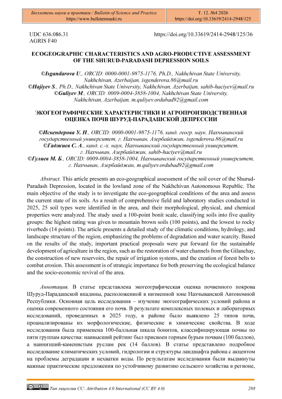 В статье представлена экогеографическая оценка почвенного покрова Шуруд-Парадашской впадины, расположенной в низменной зоне Нахчыванской Автономной Республики. Основная цель исследования – изучение экогеографических условий района и оценка современного состояния его почв. В результате комплексных полевых и лабораторных исследований, проведенных в 2025 году, в районе было выявлено 25 типов почв, проанализированы их морфологические, физические и химические свойства. В ходе исследования была применена 100-балльная шкала бонитов, классифицирующая почвы по пяти группам качества: наивысший рейтинг был присвоен горным бурым почвам (100 баллов), а наинизший-каменистым руслам рек (14 баллов). В статье представлено подробное исследование климатических условий, гидрологии и структуры ландшафта района с акцентом на проблемы деградации и нехватки воды. По результатам исследования были выдвинуты важные практические предложения по устойчивому развитию сельского хозяйства в регионе, такие как восстановление водных каналов из Гиланчай, строительство новых водохранилищ, ремонт систем канатов и создание лесополос для борьбы с эрозией. Эта оценка имеет стратегическое значение как для сохранения экологического баланса, так и для социально-экономического возрождения района.