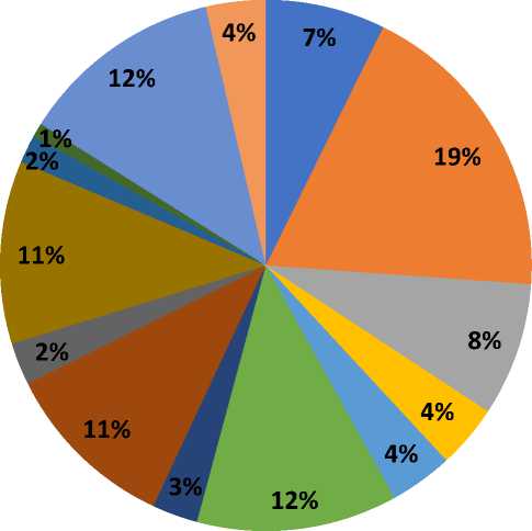 Fig. 1. Key factors influencing the growth of GRP and economic security of a region: 19% — state of the financial system, 12% — quality of infrastructure, 12% — political stability, 11% — investment activity of the state and business, 11% — level of entrepreneurial activity, 8% — accessibility and development of the national credit system, 7% — quality of infrastructure, 4% — existing taxation system, 4% — tariff regulation system, 4% — overcoming corruption, 3% — national education system, 2% — nature of innovation activity, 2% — characteristics of national culture, 1% — volume of research and development work 7.