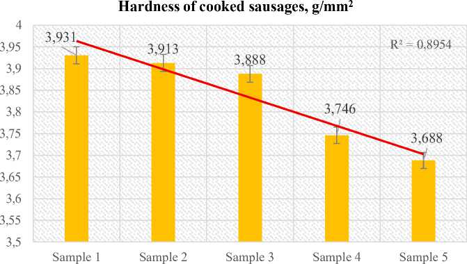 (3,913 g/mm²). At the same collagen level, adding cranberry powder led to further declines and at 3% cranberry (Sample 5) hardness was reduced by 6,18% than control. A linear trendline (R² = 0,895) confirms the overall decrease across the series of cooked sausage samples.