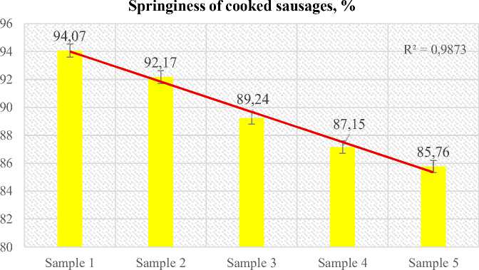 Springiness is the extent to which a sample returns to its original height after the first compression in TPA. It is computed from the force–time (or force–distance) curve as the ratio of the recovered distance between the first and second compressions to the initial compression distance. As can be seen in Figure 2, the control sample of cooked sausages (Sample 1) showed the maximum springiness —94,07%. When 10% collagen hydrolysate was added (Sample 2), springiness decreased to 92,17%, which is a 2,02% decrease compared to the control. The addition of cranberry powder with the same hydrolysate content was accompanied by a further decrease in springiness. The minimum value was observed in Sample 5 (85,76%), where the index decreased by 8,83% relative to the control. The trend line (R² = 0,9873) confirms a steady decrease in springiness with an increase in the concentration of additives in the recipe.