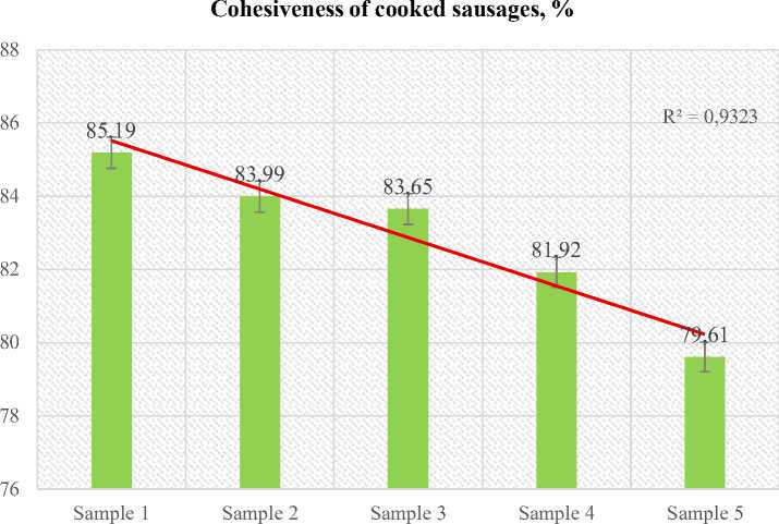 Cohesiveness quantifies the internal bonding of the sample and its resistance to breakdown on the second bite. In TPA it is computed as the area ratio of the second to the first compression from the force–time curve. As can be seen in Figure 3, the control sample (Sample 1) showed the maximum cohesion – 85,19%. When 10% hydrolysate was added to cooked sausages (Sample 2), cohesion decreased to 83.99% (-1,41% relative to the control). The addition of cranberry powder at a fixed level of hydrolysate was accompanied by a further decrease in the indicator: at 1% powder – 83,65%, at 2% – 81,92%, at 3% cohesion decreased to 79,61%. The trend line (R² = 0,9323) also confirms a steady decrease in cohesion with increasing additive concentration.