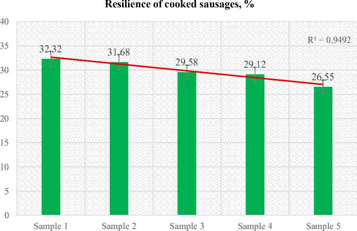 Resilience is the instantaneous elastic recovery upon release after the first compression in TPA. It is computed as the ratio of the unloading work to the loading work in the first cycle, i.e., the fraction of deformation energy returned immediately. As can be seen in Figure 4, the control sample of cooked sausages (Sample 1) showed the highest stability — 32,32%. When 10% hydrolysate was added (Sample 2), stability decreased by 1,98% to 31,68%. The addition of cranberry powder at a fixed level of hydrolysate was accompanied by a further decrease in the indicator, and when 3% of the functional ingredient was added, stability decreased by 17,85% from the control and amounted to 26,55%. The trend line (R² = 0,9492) also confirms the steady downward trend of the indicator across the series of samples as the volume of additives increased.
