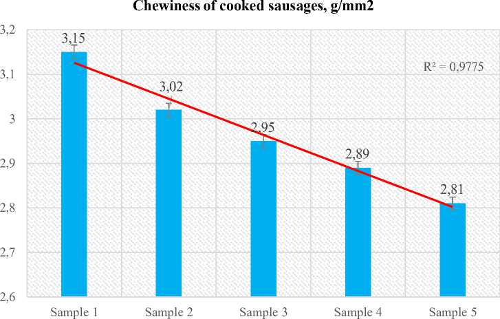 Chewiness is the work required to chew a solid sample until it is ready to swallow. In TPA it is computed as Gumminess×Springiness and reported as g/mm². As can be seen in Figure 5, the control sample of cooked sausage (Sample 1) showed the maximum chewability — 3,15 g/mm², while Sample 5 showed the minimum — 2,81 g/mm². The trend line (R² = 0,9775) confirms a steady downward trend in chewability as the amount of plant ingredients in the cooked sausage recipe increases.