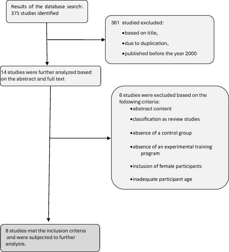 Through subsequent analysis of these 14 studies, an additional 6 were excluded based on several criteria: content of the abstract, classification as systematic review articles, absence of a control group, absence of an experimental training program, inclusion of female participants, and inadequate age of participants.