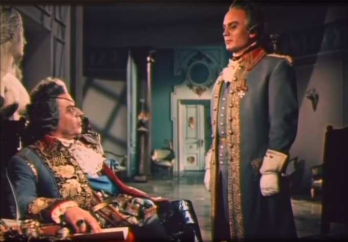 «Что до потомков, авось разберутся. А мне надобно турок бить!» Б. Н. Ливанов в роли Г. А. Потемкина и И. Ф. Переверзев в роли Ф. Ф. Ушакова в фильме «Адмирал Ушаков» (1953)