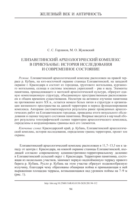 Елизаветинский археологический комплекс расположен на правой террасе р. Кубань, на юго-восточной окраине станицы Елизаветинской, на западной окраине г. Краснодара и состоит из городища, грунтового могильника, курганного могильника, селища и системы земляных укреплений – рва и вала. Элементы памятника, принадлежащего к меотской археологической культуре, образуют единую композиционную структуру, объединенную пространственным расположением и общим временем существования. Несмотря на активное изучение памятника на протяжении всего XX в., остается немало белых пятен в структуре и организации жизненного пространства на данной территории в период функционирования комплекса. Авторами систематизируются результаты ранее проведенных археологических работ на Елизаветинском городище, приведены итоги визуального обследования и оценка текущего состояния памятника. Впервые вводятся в научный оборот результаты топографической съемки территории археологического комплекса, определены и координированы границы всех его элементов.