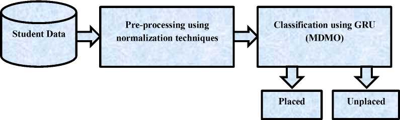 The project intends to create an extremely effective AI-based prediction model designed especially for predicting academic success. As depicted in figure 1, the research flow for predicting academic performance follows a structured multi-step process. Initially, the student dataset undergoes normalization techniques to enhance data quality by reducing noise and refining inputs. This preprocessing phase is critical to ensuring the effectiveness of subsequent analyses. Following preprocessing, advanced prediction techniques are applied, with a primary focus on the GRU model. The GRU model is utilized to categorize students into placed or unplaced categories [27]. To optimize the GRU model's performance, the MDMO optimizer is employed [28]. This integration of the GRU model with the MDMO optimizer demonstrates promising potential for improving accuracy in predicting students' placement outcomes.