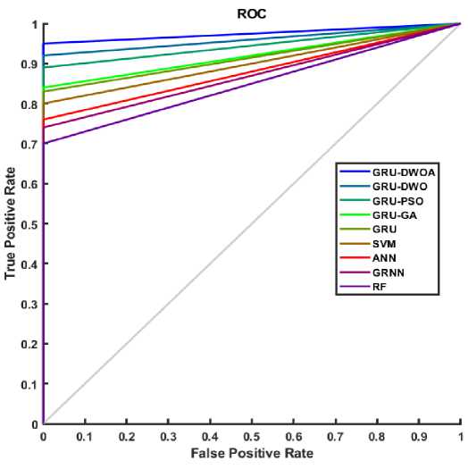 Figure 6 illustrates the ROC curve used to evaluate the performance of various classification models in predicting student placements. The curve plots sensitivity (true positive rate) against the false positive rate, with the diagonal line representing random classification. Models closer to the top-left corner demonstrate better performance. Among the models compared—GRU-DWOA, GRU-DWO, GRU-PSO, GRU-GA, standard GRU, SVM, ANN, GRNN, and RF. GRU-DWOA shows the strongest results with high sensitivity and low false positive rate. GRU-DWO and GRU-PSO also perform well, while RF and GRNN perform poorly, nearing random classification. The ROC curve shapes indicate that GRU-DWOA likely has the highest AUC, suggesting superior classification capability.