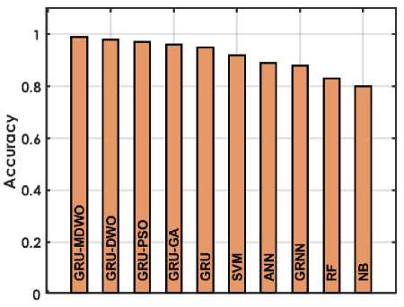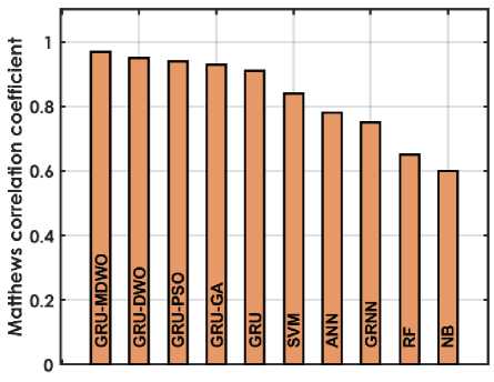 To validate the significance of the performance improvements achieved by the GRU-MDMO model, statistical significance tests were conducted. A paired t-test was applied to compare the performance of GRU-MDMO against baseline models (SVM, ANN, RF, and standard GRU) across five independent cross-validation runs. The test results indicated that GRU-MDMO significantly outperformed the other models in terms of accuracy and MCC, with p-values < 0.01, confirming that the observed improvements are not due to random variation. Additionally, 95% confidence intervals were computed for key performance metrics. The GRU-MDMO model achieved an accuracy of 98.5% ± 0.42%, MCC of 96.97% ± 0.38%, and sensitivity of 97.78% ± 0.51%, indicating strong consistency and reliability. These findings substantiate the robustness of the proposed approach and validate its statistical superiority over conventional models.