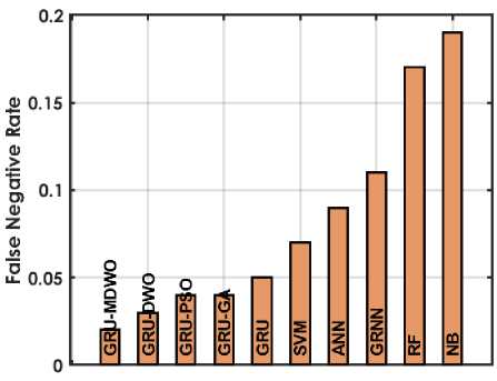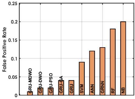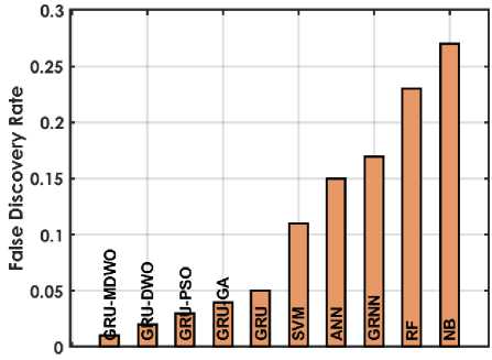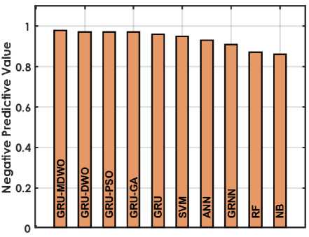 The figure 4 offers a detailed comparison of various machine learning techniques based on performance metrics for predicting student placements. The GRU-MDMO model stands out with the highest accuracy at 98.5%, indicating it makes the most correct predictions overall. It also exhibits low rates in both FDR and FNR, at 11.236% and 2.222% respectively; indicating it seldom misclassifies students who are placed or fails to identify those who are. Additionally, its FPR is exceptionally low at 0.9091%, highlighting its precision in predicting students who are not placed. This model also achieves the highest MCC of 96.9716%, reflecting its superior quality in binary classifications, alongside high NPV and PPV of 98.1982% and 98.8764% respectively, ensuring reliable predictions in both negative and positive classes. Furthermore, it excels in Sensitivity and Specificity with scores of 97.7778% and 99.0909%, effectively identifying both true positives and true negatives. In comparison, other GRU variants like GRU-DWO and GRU-PSO also perform robustly but slightly lag behind in FDR and FNR, indicating a higher tendency to incorrectly predict student placements. Traditional models like SVM, ANN, RF, and NB display moderate to lower performances across these metrics, particularly struggling with higher FDR and FNR, which impacts their reliability and accuracy in making predictions. Models like RF and NB especially exhibit higher FPR and lower MCC, PPV, and NPV, which compromise their effectiveness compared to GRU models.