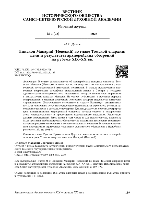 В статье рассказывается об архиерейских поездках епископа Томского Макария (Невского) в 1892–1904 гг. по епархии и их сопоставление с проводимой государственной имперской политикой. В начале исследования проводится корреляция специфики епархиальной жизни в Сибири с методами административноепархиального управления, которые имели свое выражение в деятельности владыки Макария. На основе публикаций о поездках иерарха, содержащихся в местной церковной периодике, автором выделяются категории «правильного» (благочестивое отношение к «храму Божиему», священникам и т. п.) и «неправильного» (игнорирование прихожанами церковного устава и нахождение человека в расколе, староверии). Данная дихотомия ярко иллюстрирует цель инспекционных мероприятий епископа, которая состоит в искоренении этого «неправильного» и просвещения православного населения. Реализация данных мероприятий была важна в том числе и для правительства, поскольку была призвана стабилизировать обстановку на окраинных имперских территориях с разнородным этническим и конфессиональным составом. В качестве результата исследования приводится сравнение религиозной обстановки в Приобском регионе с 1891 по 1904 гг.