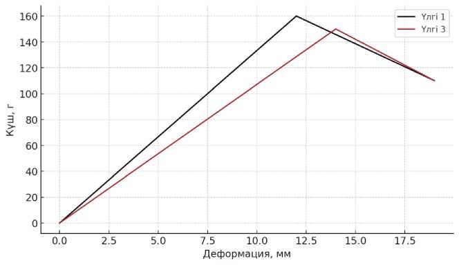 Графиктен керiнiп турFандай, 1-улгшш, қисығы біртіндеп жоғары өрлеп, сығылуға царсыласу цабшетшш, жоFары екендшш бай-цатады. Ал 3-улгшш, cызыFы салыстырмалы түрде төмен траектория көрсетіп, құрылымының жұмсақтығын және аздап серпімді екенін білдіреді. Бұл деректер органолептикалық талдау нэтuжeлeрiмeн де сэйкес кeлeдi: 1-Yлгi тыFыз эрi бiртeктi конcucтeнцuяFа ие болса, 3-Yлгiдe шырындылыFы жоFары болFанымeн, цурылым-дыц бeрiктiгi темендеу.