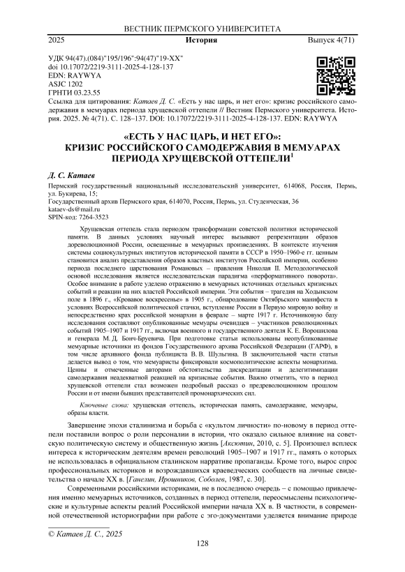 Хрущевская оттепель стала периодом трансформации советской политики исторической памяти. В данных условиях научный интерес вызывают репрезентации образов дореволюционной России, освещенные в мемуарных произведениях. В контексте изучения системы социокультурных институтов исторической памяти в СССР в 1950‒1960-е гг. ценным становится анализ представления образов властных институтов Российской империи, особенно периода последнего царствования Романовых – правления Николая II. Методологической основой исследования является исследовательская парадигма «перформативного поворота». Особое внимание в работе уделено отражению в мемуарных источниках отдельных кризисных событий и реакции на них властей Российской империи. Эти события – трагедия на Ходынском поле в 1896 г., «Кровавое воскресенье» в 1905 г., обнародование Октябрьского манифеста в условиях Всероссийской политической стачки, вступление России в Первую мировую войну и непосредственно крах российской монархии в феврале ‒ марте 1917 г. Источниковую базу исследования составляют опубликованные мемуары очевидцев ‒ участников революционных событий 1905‒1907 и 1917 гг., включая военного и государственного деятеля К. Е. Ворошилова и генерала М. Д. Бонч-Бруевича. При подготовке статьи использованы неопубликованные мемуарные источники из фондов Государственного архива Российской Федерации (ГАРФ), в том числе архивного фонда публициста В. В. Шульгина. В заключительной части статьи делается вывод о том, что мемуаристы фиксировали космополитические аспекты монархизма. Ценны и отмеченные авторами обстоятельства дискредитации и делегитимизации самодержавия неадекватной реакцией на кризисные события. Важно отметить, что в период хрущевской оттепели стал возможен подробный рассказ о предреволюционном прошлом России и от имени бывших представителей промонархических сил.