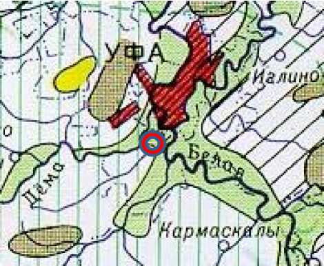 Примерное расположение изученных насаждений показано красным кругом. Район исследований ограничен координатами 54,485557-54,489117 с.ш. и 55,806072-55,807037 в.д.