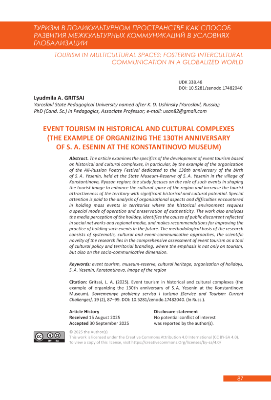 The article examines the specifics of the development of event tourism based on historical and cultural complexes, in particular, by the example of the organization of the All- Russian Poetry Festival dedicated to the 130th anniversary of the birth of S. A. Yesenin, held at the State Museum- Reserve of S. A. Yesenin in the village of Konstantinovo, Ryazan region; the study focuses on the role of such events in shaping the tourist image to enhance the cultural space of the region and increase the tourist attractiveness of the territory with significant historical and cultural potential. Special attention is paid to the analysis of organizational aspects and difficulties encountered in holding mass events in territories where the historical environment requires a special mode of operation and preservation of authenticity. The work also analyzes the media perception of the holiday, identifies the causes of public discontent reflected in social networks and regional media, and makes recommendations for improving the practice of holding such events in the future. The methodological basis of the research consists of systematic, cultural and event- communicative approaches, the scientific novelty of the research lies in the comprehensive assessment of event tourism as a tool of cultural policy and territorial branding, where the emphasis is not only on tourism, but also on the socio- communicative dimension.