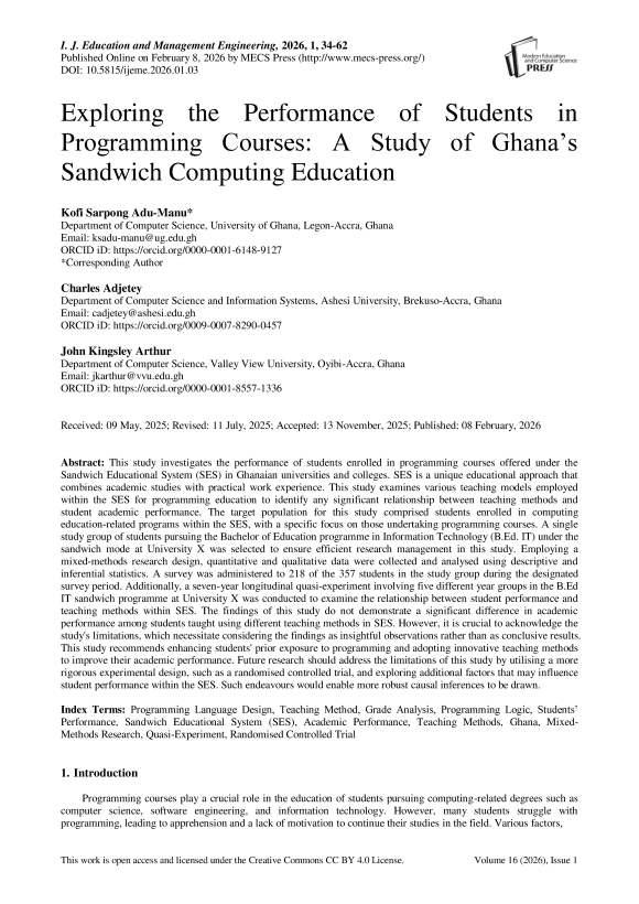 Programming Language Design, Teaching Method, Grade Analysis, Programming Logic, Students’ Performance, Sandwich Educational System (SES), Academic Performance, Teaching Methods, Ghana, Mixed-Methods Research, Quasi-Experiment, Randomised Controlled Trial