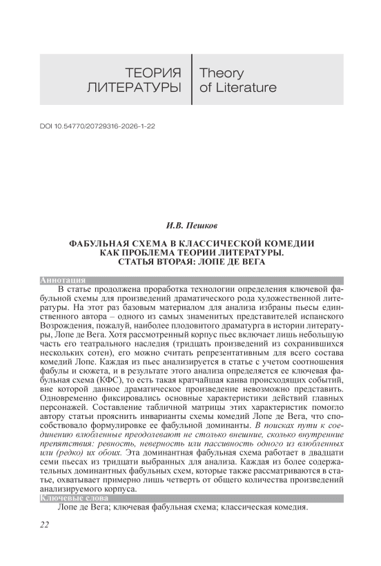 The article continues to explore the technology of determining the key plot scheme for works of dramatic fiction. This time, the base case consists of plays by a single author, Lope de Vega, perhaps the most prolific playwright in history. Although this corpus includes only a small part of his theatrical legacy (30 works), it can be considered quite representative of the Lope comedy genre. Each of the plays is analyzed in the article taking into account the ratio of plot and phabula (so I propose to translate the term of Russian formalists “фабула” into English not to confuse it with the Latin word “fabula”, which has several meanings and has nothing to do with the formalists’ terminological opposition), and as a result its key phabulous scheme (KPS) is determined, that is, such a brief outline of events, without which this work is unimaginable. At the same time, the main characteristics of the heroes’ actions were recorded. Compiling a tabular matrix of these characteristics helped clarify the invariants of the scheme, which contributed to the formulation of its plot (phabulous) dominant. In the search for the lovers’ path to union not so much external as internal obstacles are overcome: jealousy, infidelity or passivity of one of the lovers. This dominant phabulous scheme works in 27 plays from the presented corpus. Each of the more substantial dominant plot schemes discussed in the article covers no more than a quarter of the works of this corpus.