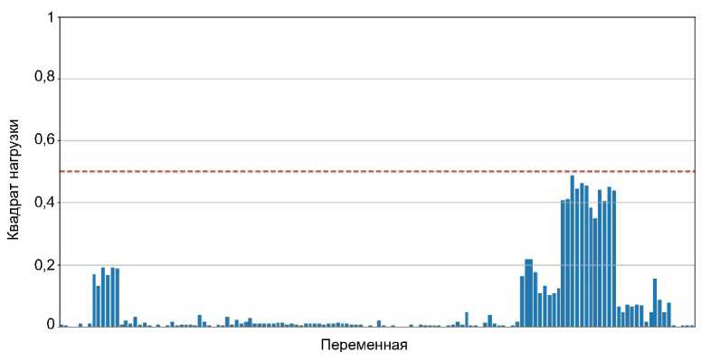 Для второго фактора (рис. 3) картина распределения квадратов нагрузок выглядит иначе – ни одна из переменных не обладает квадратом нагрузки, превосходящим 0,5. Доля дисперсии, объясненной вторым фактором, составляет 9,00 % против 37,85 % объясненной дисперсии первым фактором.