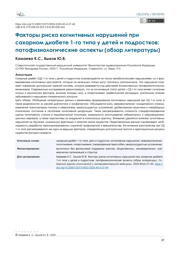 Сахарный диабет (СД) 1-го типа у детей и подростков сопровождается не только метаболическими нарушениями, но и формированием когнитивных расстройств, которые на начальных этапах могут протекать субклинически. Эти нарушения отражают поражение центральной нервной системы, которое развивается под действием множественных патофизиологических механизмов. Современные исследования демонстрируют, что на когнитивный статус детей с СД 1-го типа влияет сочетание острых и хронических факторов, включая эпизоды гипои гипергликемии, диабетический кетоацидоз, длительное течение заболевания и нарушение гликемического контроля. Цель обзора. Обобщение литературных данных о механизмах формирования когнитивных нарушений при СД 1-го типа, а также возможностях их ранней диагностики и профилактики. Обсуждаются роль нейровоспаления, оксидативного стресса, изменений транспортеров глюкозы и нейрогенеза, микрососудистых осложнений, дисбактериоза кишечника и коморбидных психических состояний в патогенезе когнитивной дисфункции. Также рассматриваются сложности стандартизированной оценки когнитивного статуса в педиатрической популяции, возможности использования лабораторных и нейровизуализационных маркеров, а также перспективы их внедрения в клиническую практику. Внимание уделяется влиянию когнитивных нарушений на обучение, социальную адаптацию и качество жизни пациентов. Представленные данные подчёркивают необходимость разработки персонализированных стратегий профилактики и вмешательства. Когнитивные расстройства при СД 1-го типа рассматриваются как один из ведущих факторов, определяющих долгосрочный прогноз и адаптационные ресурсы пациентов молодого возраста.