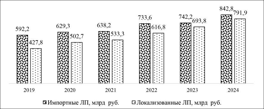 Рис. 5. Динамика объема производства лекарственных препаратов на фармацевтическом рынке России в стоимостном выражении в разрезе происхождения в 2019-2024 гг.