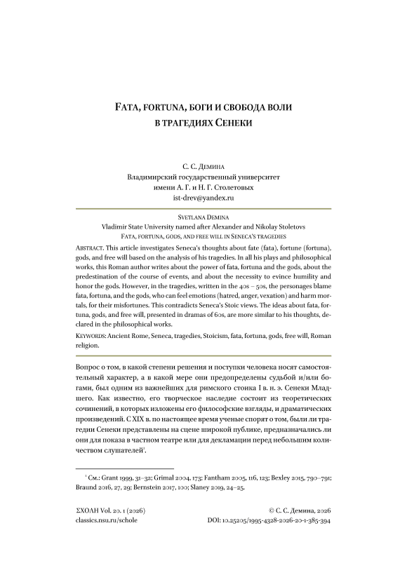 В данной статье исследуются взгляды Сенеки на судьбу (фата), удачу (фортуна), богов и свободу воли на основе анализа его трагедий. Во всех своих пьесах и философских трудах этот римский автор пишет о силе фаты, фортуны и богов, о предопределении хода событий и о необходимости проявлять смирение и почитать богов. Однако в трагедиях, написанных в 40-50-х годах, персонажи винят в своих несчастьях фату, фортуну и богов, которые способны испытывать эмоции (ненависть, гнев, раздражение) и причинять вред смертным. Это противоречит стоическим взглядам Сенеки. Идеи о фате, фортуне, богах и свободе воли, представленные в драмах 60-х годов, больше похожи на его мысли, изложенные в философских трудах.