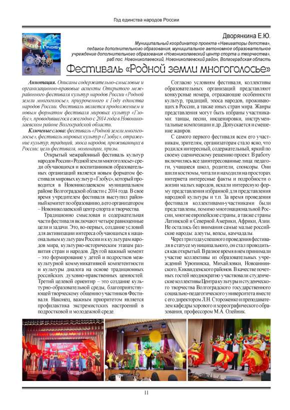 Описаны содержательно-смысловые и организационно-правовые аспекты Открытого межрайонного фестиваля культур народов России «Родной земли многоголосье», приуроченного к Году единства народов России. Фестиваль является продолжением и новым форматом фестиваля мировых культур «Глобус», проводившегося ежегодно с 2014 года в Новониколаевском районе Волгоградской области.