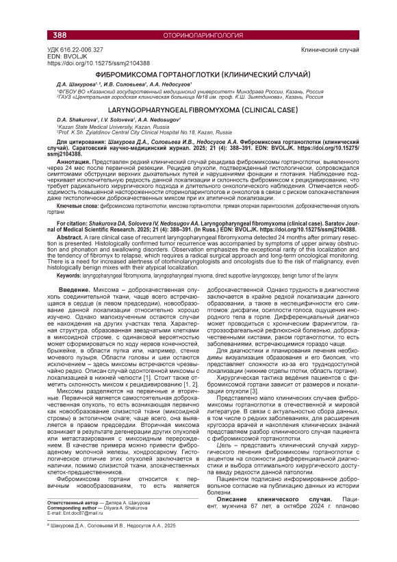 Представлен редкий клинический случай рецидива фибромиксомы гортаноглотки, выявленного через 24 мес после первичной резекции. Рецидив опухоли, подтвержденный гистологически, сопровождался симптомами обструкции верхних дыхательных путей и нарушениями фонации и глотания. Наблюдение подчеркивает исключительную редкость данной локализации и склонность фибромиксом к рецидивированию, что требует радикального хирургического подхода и длительного онкологического наблюдения. Отмечается необходимость повышенной настороженности оториноларингологов и онкологов в связи с риском озлокачествления даже гистологически доброкачественных миксом при их атипичной локализации.