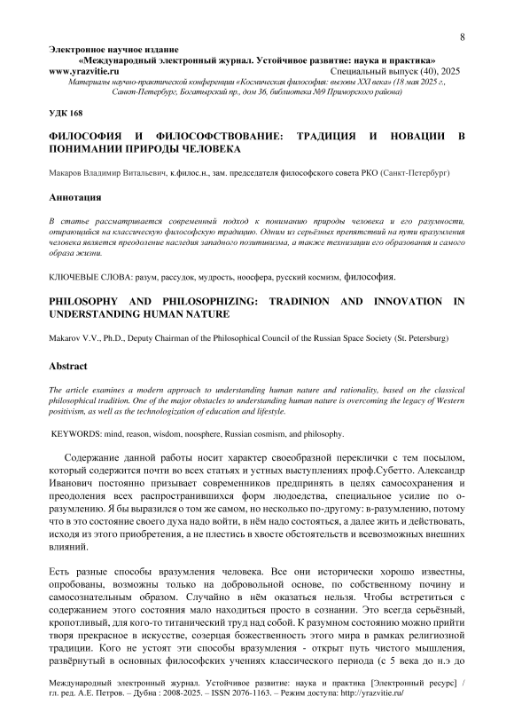 Текст научной статьи Философия и философствование: традиция и новации в понимании природы человека