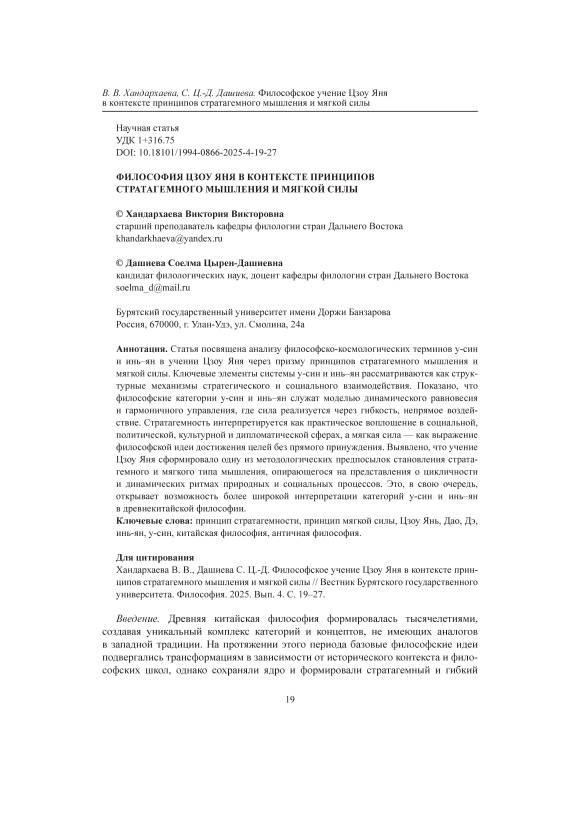 Статья посвящена анализу философско-космологических терминов у-син и инь–ян в учении Цзоу Яня через призму принципов стратагемного мышления и мягкой силы. Ключевые элементы системы у-син и инь–ян рассматриваются как структурные механизмы стратегического и социального взаимодействия. Показано, что философские категории у-син и инь–ян служат моделью динамического равновесия и гармоничного управления, где сила реализуется через гибкость, непрямое воздействие. Стратагемность интерпретируется как практическое воплощение в социальной, политической, культурной и дипломатической сферах, а мягкая сила — как выражение философской идеи достижения целей без прямого принуждения. Выявлено, что учение Цзоу Яня сформировало одну из методологических предпосылок становления стратагемного и мягкого типа мышления, опирающегося на представления о цикличности и динамических ритмах природных и социальных процессов. Это, в свою очередь, открывает возможность более широкой интерпретации категорий у-син и инь–ян в древнекитайской философии.
