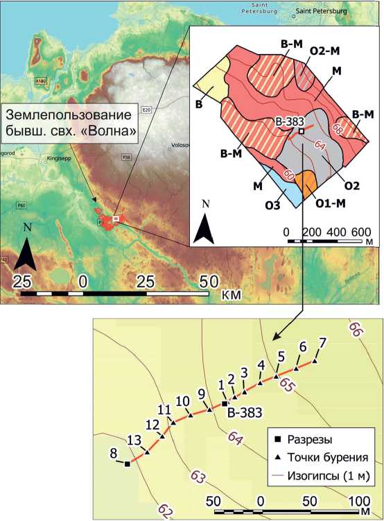 Для выявления катенарной дифференциации почв этой группы нами был выбран ключевой участок (рис. 1), расположенный также в пределах девонской равнины, в зоне землепользования бывшего совхоза «Волна» Волосовского района Ленинградской области. На относительно небольшом по площади участке 25