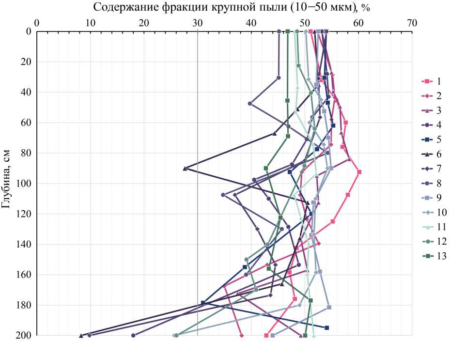 содержание фракции крупной пыли (10—50 мкм) устойчиво превышает 30 %, при этом наиболее распространено содержание данной фракции порядка 50 % от всех частиц (рис. 6). В верхней части профиля наблюдается довольно низкая степень варьирования данного параметра между буровыми скважинами, тогда как с глубины 80—100 см наблюдается увеличение диапазона варьирования содержания фракции крупной пыли между точками отбора. В целом наблюдается тенденция к снижению содержания фракции крупной пыли в диапазоне глубин 100—200 см. К глубине 200 см в пяти скважинах содержание крупной пыли составило менее 30 %, что не характерно для лёссоидов. Таким образом, можно считать установленным фактом, что верхняя метровая толща обогащена крупнопылеватой (крупноалевритистой) фракцией (0.05—0.01 мм) и, независимо от положения буровых скважин по катене и подстилания слоями, различающимися по гранулометрическому составу в нижней метровой толще, залегает плащеобразно.