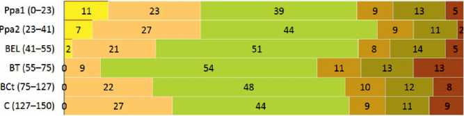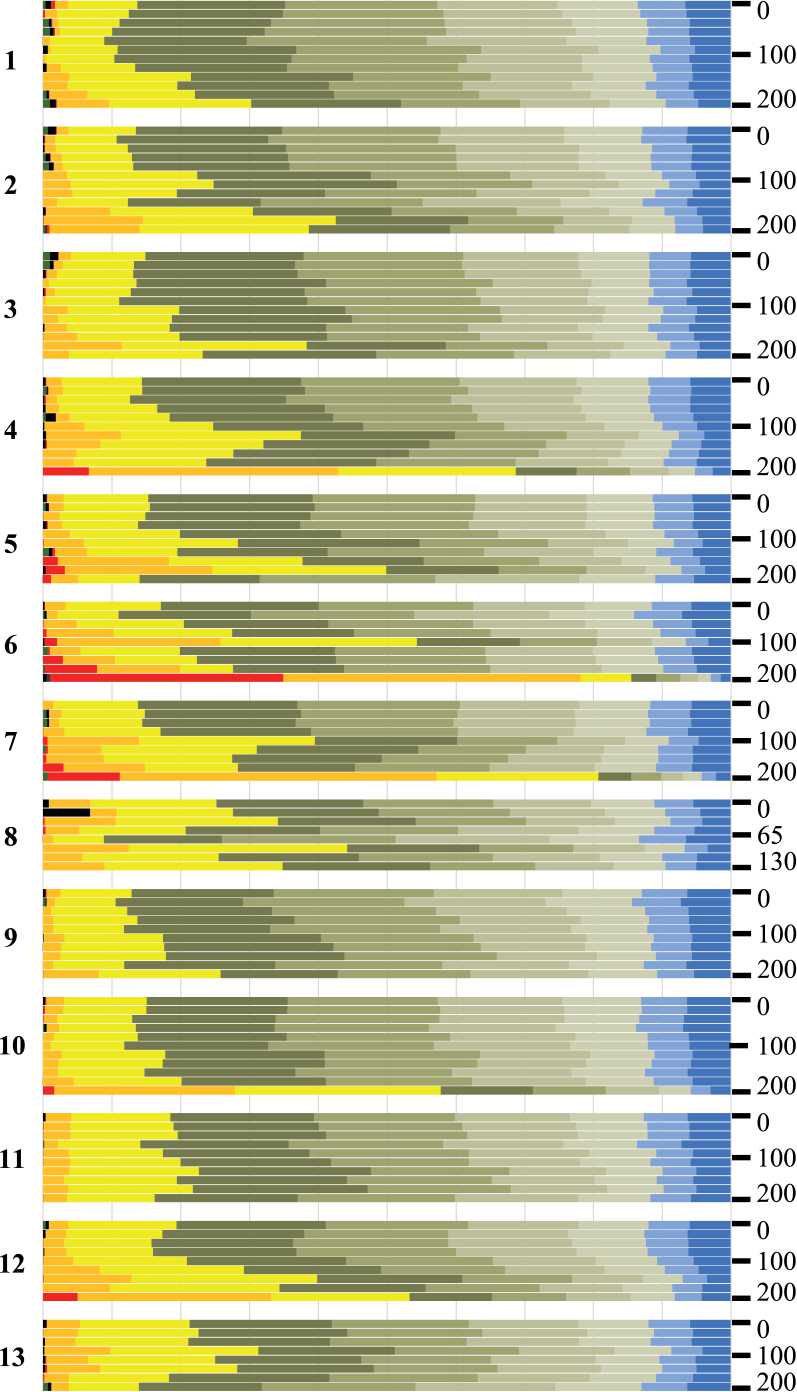 На глубине более 80—100 см выявлено сильное варьирование преобладающей фракции. При этом увеличивается только верхний предел варьирования (например, в скважине 13 на глубине 200 см доминирует фракция тонкого песка (fine sand, 125.0—250.0 мкм).
