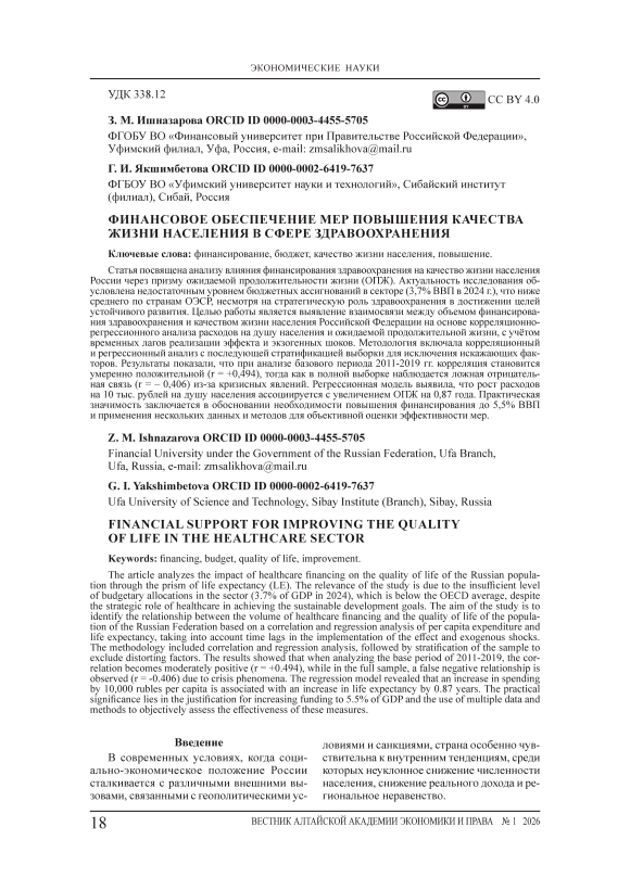 Статья посвящена анализу влияния финансирования здравоохранения на качество жизни населения России через призму ожидаемой продолжительности жизни (ОПЖ). Актуальность исследования обусловлена недостаточным уровнем бюджетных ассигнований в секторе (3,7% ВВП в 2024 г.), что ниже среднего по странам ОЭСР, несмотря на стратегическую роль здравоохранения в достижении целей устойчивого развития. Целью работы является выявление взаимосвязи между объемом финансирования здравоохранения и качеством жизни населения Российской Федерации на основе корреляционно-регрессионного анализа расходов на душу населения и ожидаемой продолжительной жизни, с учётом временных лагов реализации эффекта и экзогенных шоков. Методология включала корреляционный и регрессионный анализ с последующей стратификацией выборки для исключения искажающих факторов. Результаты показали, что при анализе базового периода 2011-2019 гг. корреляция становится умеренно положительной (r = +0,494), тогда как в полной выборке наблюдается ложная отрицательная связь (r = – 0,406) из-за кризисных явлений. Регрессионная модель выявила, что рост расходов на 10 тыс. рублей на душу населения ассоциируется с увеличением ОПЖ на 0,87 года. Практическая значимость заключается в обосновании необходимости повышения финансирования до 5,5% ВВП и применения нескольких данных и методов для объективной оценки эффективности мер.
