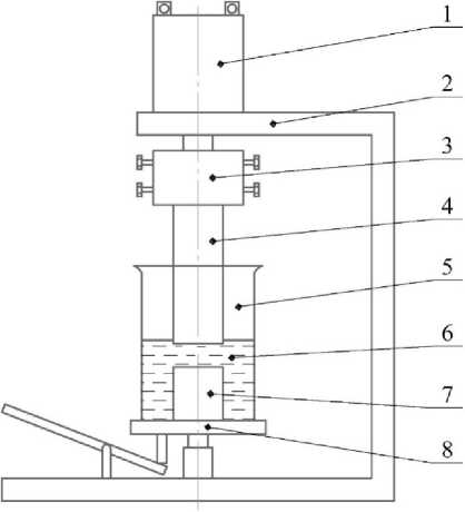 Рис. 1. Схема установки для проведения холодного моделирования: 1 – двигатель; 2 – монтажная станина; 3 – электрододержатель; 4 – электрод; 5 – стеклянный сосуд; 6 – сплав Вуда; 7 – дорн; 8 – подающий механизм Fig. 1. Diagram of the setup for cold modeling: 1 – engine; 2 – mounting frame; 3 – electrode holder; 4 – electrode; 5 – glass vessel; 6 – Wood’s alloy;
