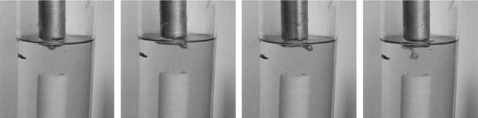 В зависимости от скорости вращения изменялось место доставки капель электродного металла от центра к стенкам кристаллизатора. Расчетная оптимальная скорость вращения электрода для данного случая составляла 310 об/мин. Скорость находилась исходя из расчетов, представленных в работе [18]. Экспериментальная скорость, при которой капли жидкого металла имеют необходимое место доставки, находилась в диапазоне 290–340 об/мин, что соответствует значению. На рис. 2 приведена раскадровка хода эксперимента.