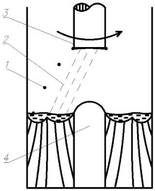 Рис. 3. Схема поведения потока электронов: 1 – капли электродного металла; 2 – поток электронов;