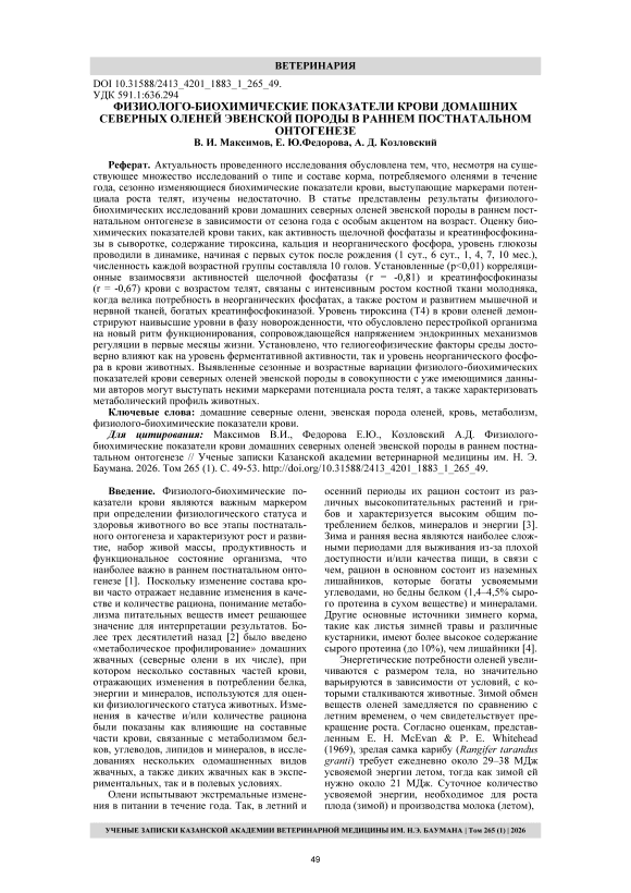 Введение. Физиолого-биохимические показатели крови являются важным маркером при определении физиологического статуса и здоровья животного во все этапы постнатального онтогенеза и характеризуют рост и развитие, набор живой массы, продуктивность и функциональное состояние организма, что наиболее важно в раннем постнатальном онтогенезе [1]. Поскольку изменение состава крови часто отражает недавние изменения в качестве и количестве рациона, понимание метаболизма питательных веществ имеет решающее значение для интерпретации результатов. Более трех десятилетий назад [2] было введено «метаболическое профилирование» домашних жвачных (северные олени в их числе), при котором несколько составных частей крови, отражающих изменения в потреблении белка, энергии и минералов, используются для оценки физиологического статуса животных. Изменения в качестве и/или количестве рациона были показаны как влияющие на составные части крови, связанные с метаболизмом белков, углеводов, липидов и минералов, в исследованиях нескольких одомашненных видов жвачных, а также диких жвачных как в экспериментальных, так и в полевых условиях.